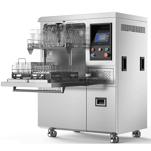 將實(shí)驗(yàn)室器皿裝載到器皿裝載籃架上通過(guò)滑軌載入清洗機(jī)內(nèi)腔中,通過(guò)清洗步驟去除器皿上的污染物(包括有機(jī)物、無(wú)機(jī)物、蛋白質(zhì)等),使器皿上的殘留物被清洗掉;通過(guò)漂洗步驟去除器皿上污染物和清洗劑殘留,使器皿上離子殘留量低于檢測(cè)下限,通過(guò)去除器皿上細(xì)胞、病毒、細(xì)菌殘留,使活微生物數(shù)量減少到規(guī)定水平;通過(guò)干燥步驟去除器皿表面殘留水,使殘留水汽化后蒸發(fā)。
